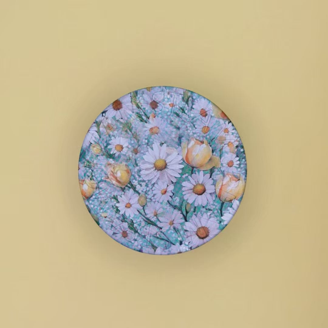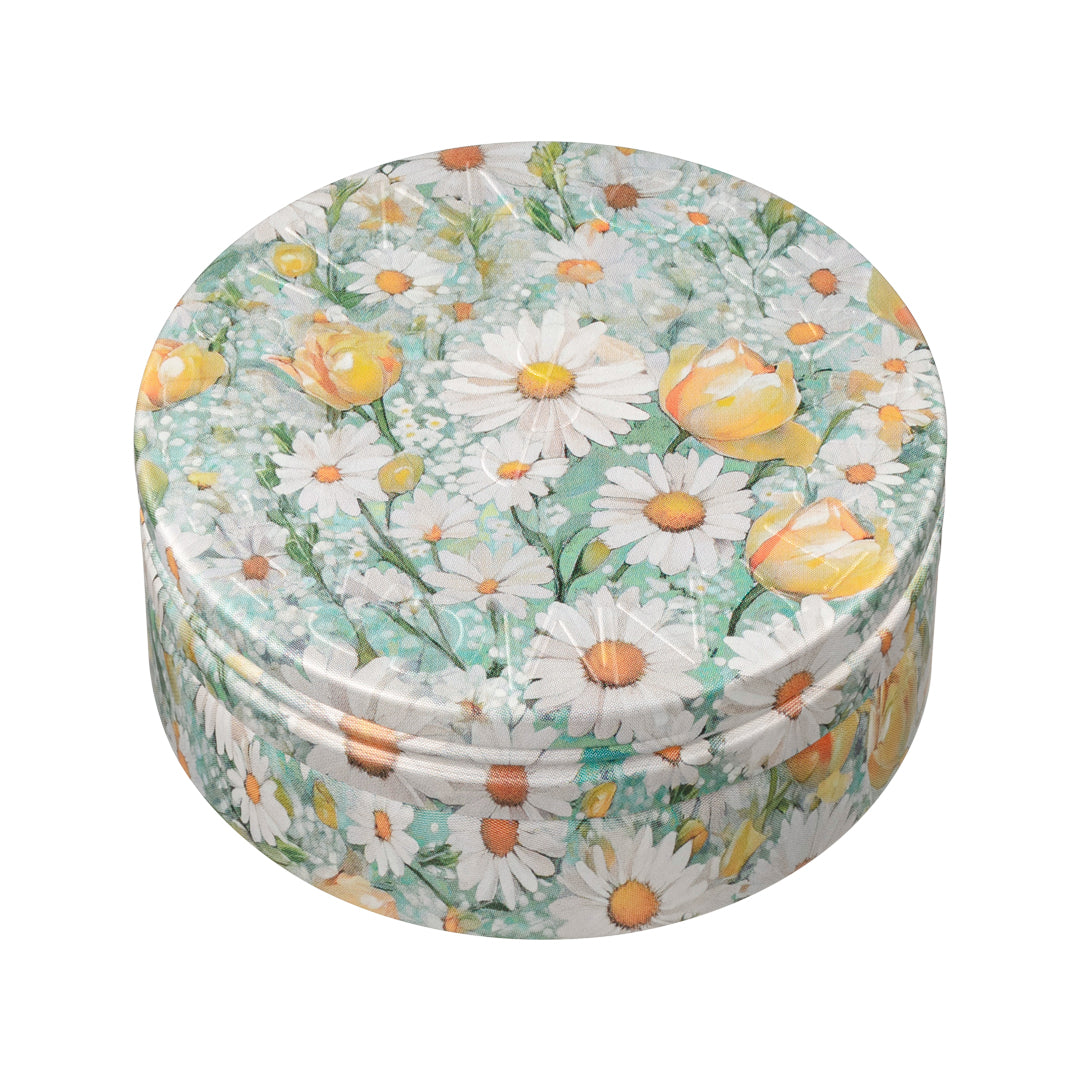 草原に咲くチューリップ、カモミールのお花をイメージしたデザインです。実物の缶は透明感がある仕上がりで、さわやかな印象です。