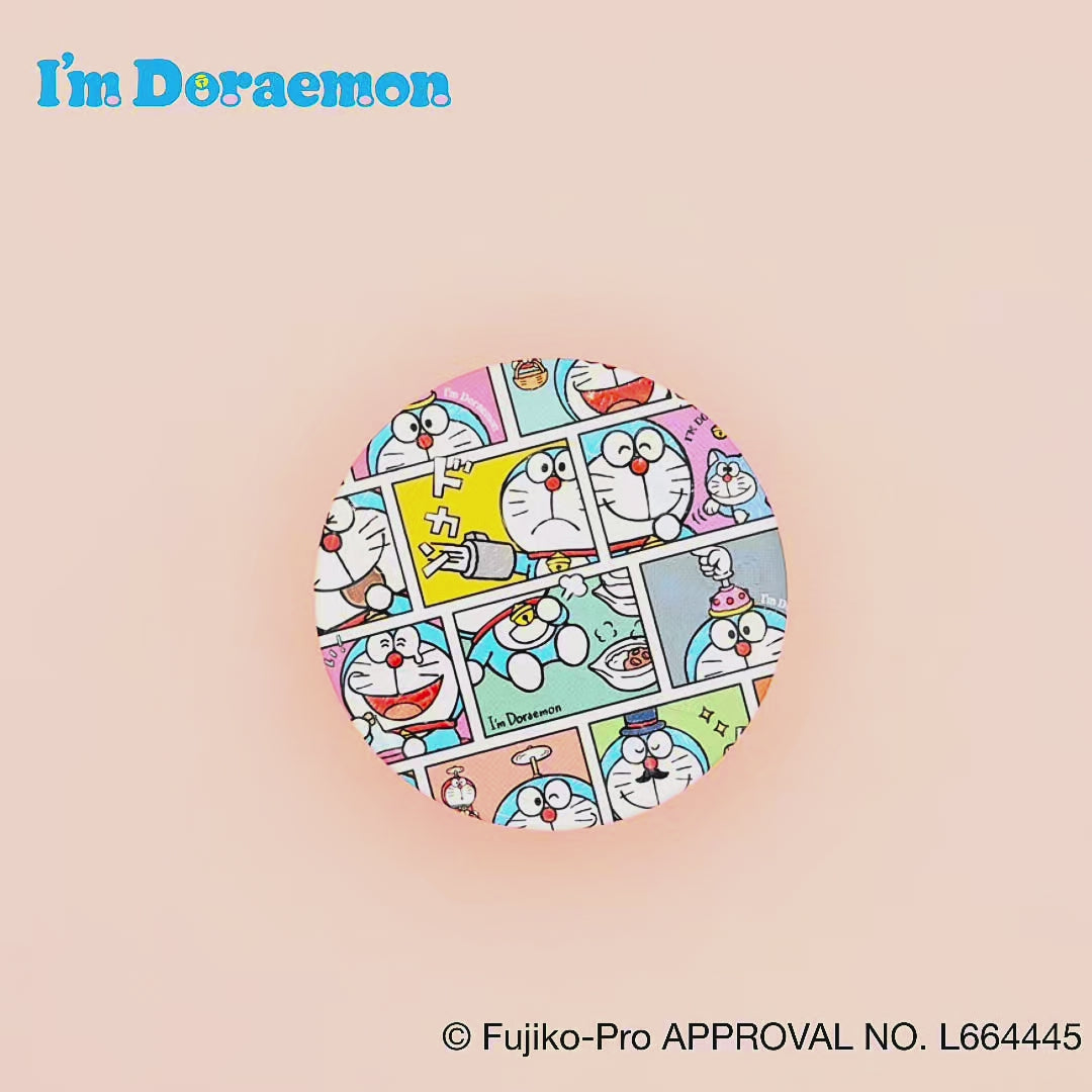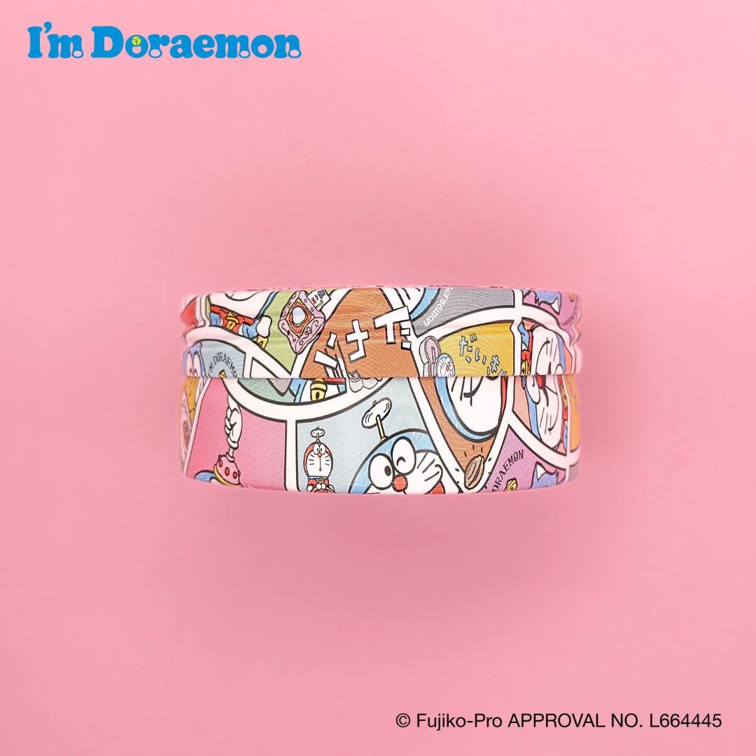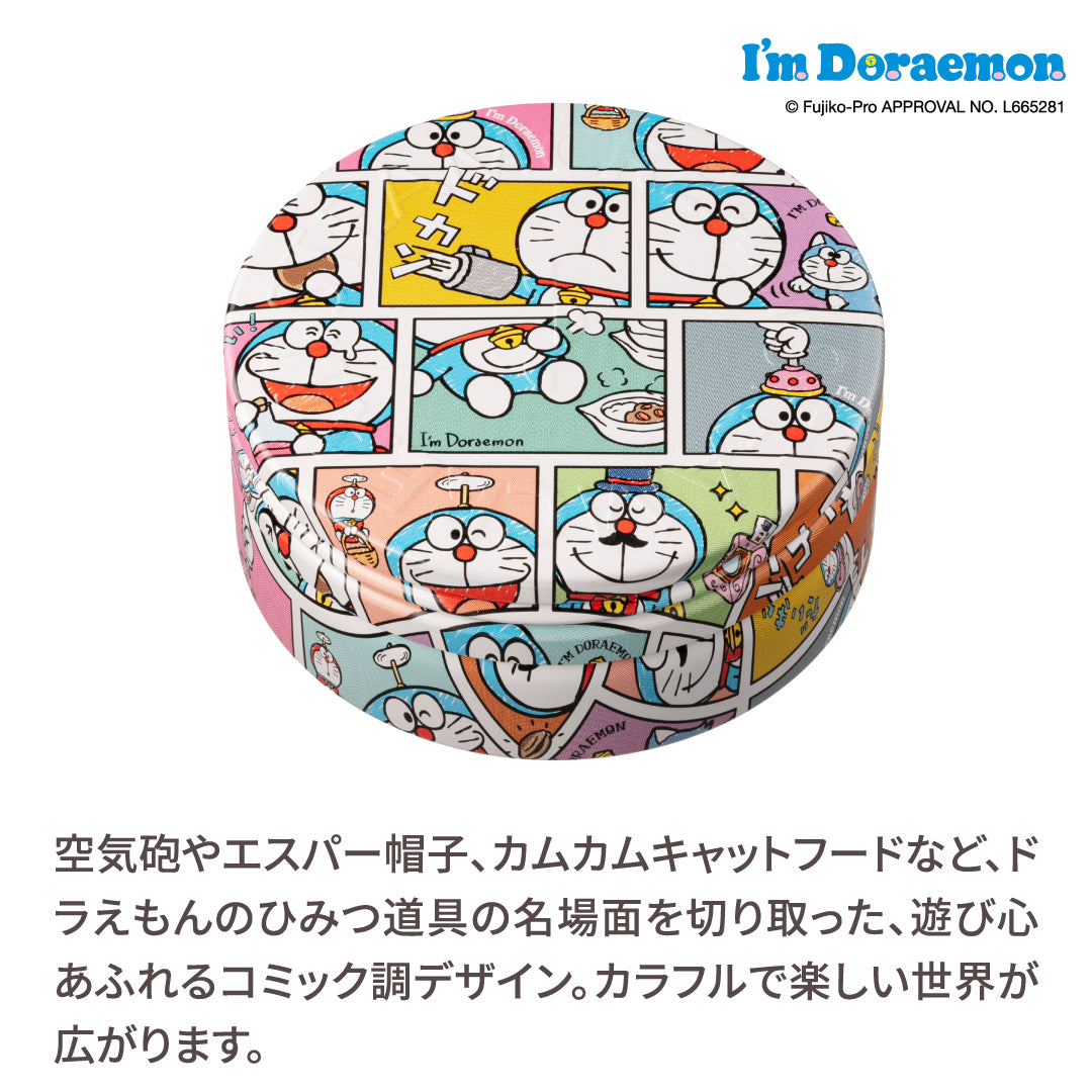 空気砲やエスパー帽子、カムカムキャットフードなど、ドラえもんとひみつ道具が描かれたコミック調デザイン。カラフルで楽しい世界が広がります。
